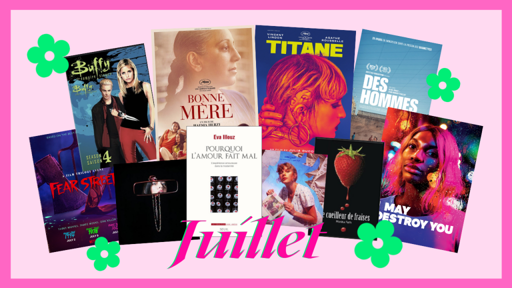 Juillet étant avant tout le mois du Festival de Cannes, c’était l’occasion parfaite d’aller au cinéma pour découvrir les premiers films de la sélection. Pour ma part, je me suis consacrée à Annette de Leos Carax, Bonne mère de Hafsia Herzi et, évidemment, Titane de Julia Ducournau. Si Annette m’a émue et (surtout) amusée avec ses chansons pas toujours bienvenues, Bonne mère a été pour le coup la bonne surprise inattendue. J’ai beaucoup d’affection pour le travail de Hafsia Herzi que j’aime beaucoup en tant qu’actrice et ayant raté son premier long métrage, Tu mérites un amour, j’ai vraiment apprécié la découvrir derrière la caméra en tant que réalisatrice pleine de pudeur, portant un regard sur la banlieue marseillaise où elle même a grandi. Bonne mère est un beau film sans prétention qui explore différents portraits de mères au sein des classes sociales immigrées et défavorisées du sud. J’ai aussi apprécié Titane pour son esthétique, son body horror hyper maîtrisé et son audace, même si j’avoue avoir peu accroché aux thèmes familiaux que Julia Ducournau explorait déjà dans Grave et que je ne m’attendais pas forcément à voir ressurgir ici. C’était cependant un bon prétexte à un propos sur la masculinité et le corps, chose qu’on ne voit que trop peu au cinéma et surtout en France.