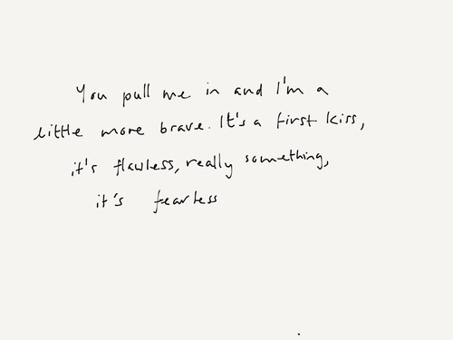 « Kiss me on the sidewalk, take away the pain » écris-je avec application à l’intérieur de la couverture de mon journal intime à l’encre indélébile. J’ai 13 ans, et alors que je rêve à mes futures prochaines premières amoures, cette phrase s’ancre profondément en moi et résonne comme un secret -un de plus, entre moi et Taylor Swift. Le collège touche à sa fin et elle vient de partager avec le monde son deuxième et tant attendu album, Speak Now. Je suis une adolescente discrète, bonne élève, sans histoire ; mais au fond de moi bouillonne un univers romanesque, fait de passion et de rencontres imprévues, dans lequel se fondent les comédies romantiques que j’ai vues, les romans à l’eau de rose que j’ai lus et les chansons d’amour américaines que j’ai entendues. Allongée en travers de mon lit de petite fille, j’écoute cet album en boucle et je mémorise religieusement les paroles de chaque chanson ainsi que les histoires qu’elles racontent : la naissance du désir, la méchanceté des filles plus populaires, le courage d’élever la voix et l’embrassement du futur doré qu’il me reste à écrire. Je danse dans ma chambre et je rêve à ce que seront mes années de lycée et mon premier baiser, et tout me semble encore possible : rencontrerai-je quelqu’un qui fera de moi, a careless man’s careful daughter, une femme épanouie ? Serai-je dévastée par une rupture et m’allongerai-je moi aussi sur le sol en rêvant à notre last kiss ?